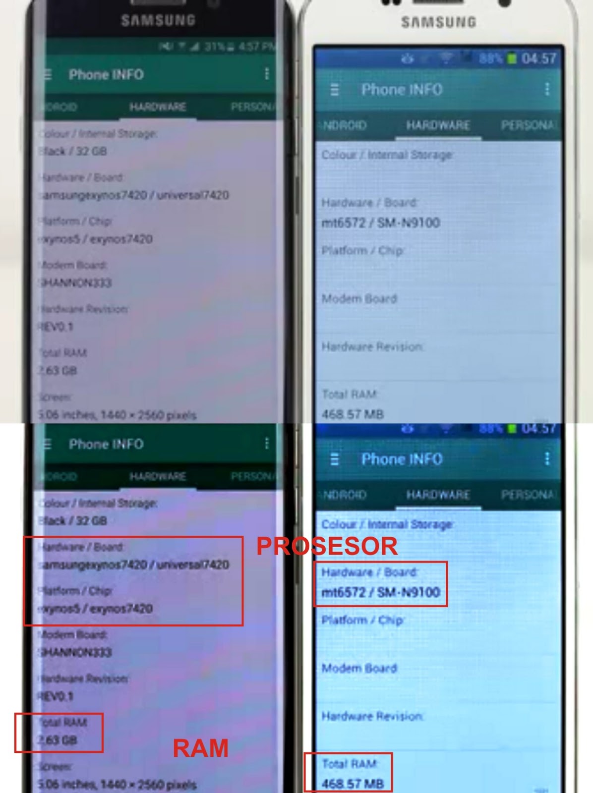 Untuk menghindari penjual yang nakal dan kekecewaan saat membeli sebuah handset baik itu smartphone ataupun tablet, alangkah baiknya sebelum kita memutuskan untuk membeli gadget tersebut setidaknya kita harus mengetahui spesifikasi teknis dasar dari gadget yang bersangkutan. Misalnya pada bahasan kali ini, kita akan membahas mengenai Samsung Galaxy S6 asli dan KW, seperti apa S6 yang asli dan seperti apa S6 yang KW atau palsu. Untuk melihat spesifikasi lengkap Samsung Galaxy S6 dan Galaxy S6 Edge, kita sudah membahas pada tulisan-tulisan sebelumnya.Secara garis besar, yang harus kita ketahui dari spesifikasi sebuah gadget dalam hal ini Samsung Galaxy S6 adalah prosesor, memori (RAM) dan kamera. Tiga hal utama tersebut mudah untuk diketahui dan antara S6 yang asli dan yang KW tidak akan sama alias pasti berbeda !